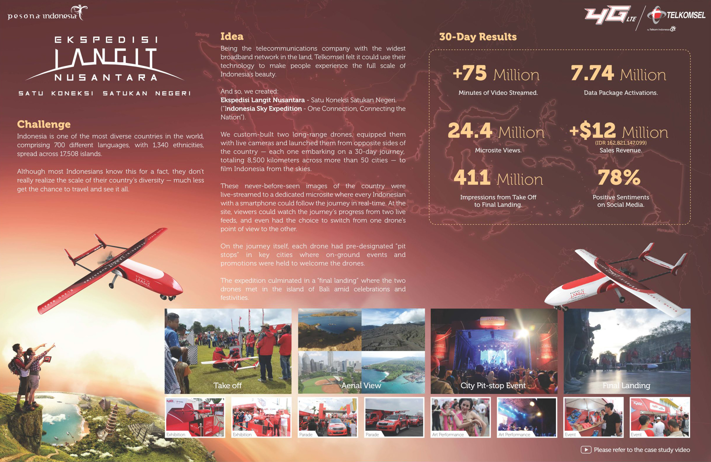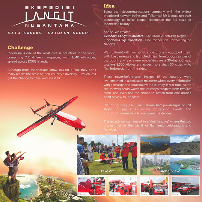 这些从未见过的国家影像被直播到一个专门的微型网站上,在这个微型网站上,每个印度尼西亚人都可用智能手机实时跟踪这段旅程。在该网站,观众可以通过两架无人机实时传回的画面观看旅程的进展情况,甚至可以选择从一个无人机的角度切换到另一个。