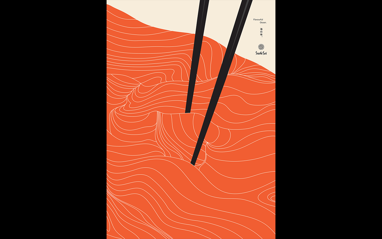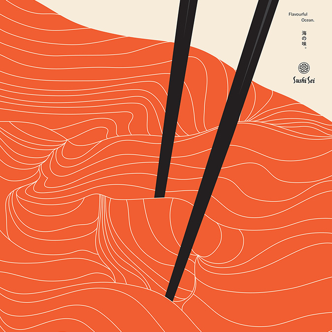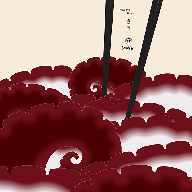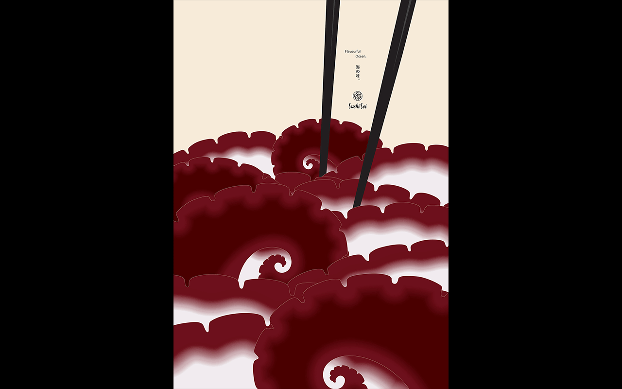 “Sushi Sei”是印度尼西亚一家由一位日本厨师掌门的正宗日本餐馆。它的大多数客户都是雅加达的日本侨民,他们对日本食物的品味和要求标准都非常高。“Sushi Sei”需要一种方法来传达其配料和食物的新鲜度。于是系列海报应需而生。设计看上去像大海的波浪。但仔细看,它们实际上是鲑鱼和章鱼图案。海报中文案“Flavourful Ocean”字样醒目,传达了“Sushi Sei”作为一个正宗的日本餐厅,具备与日本抗衡的实力。