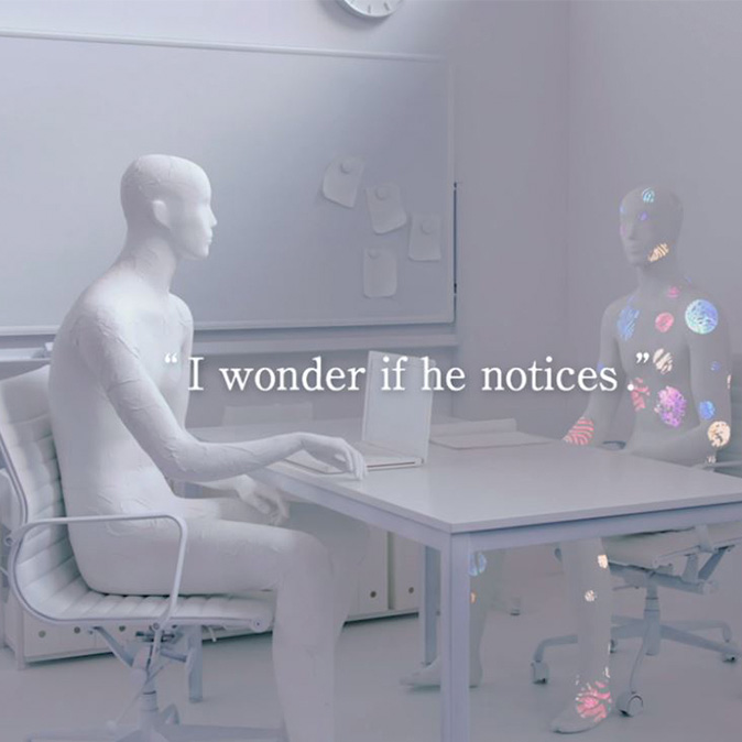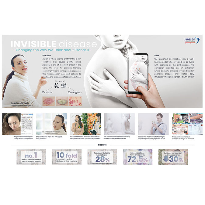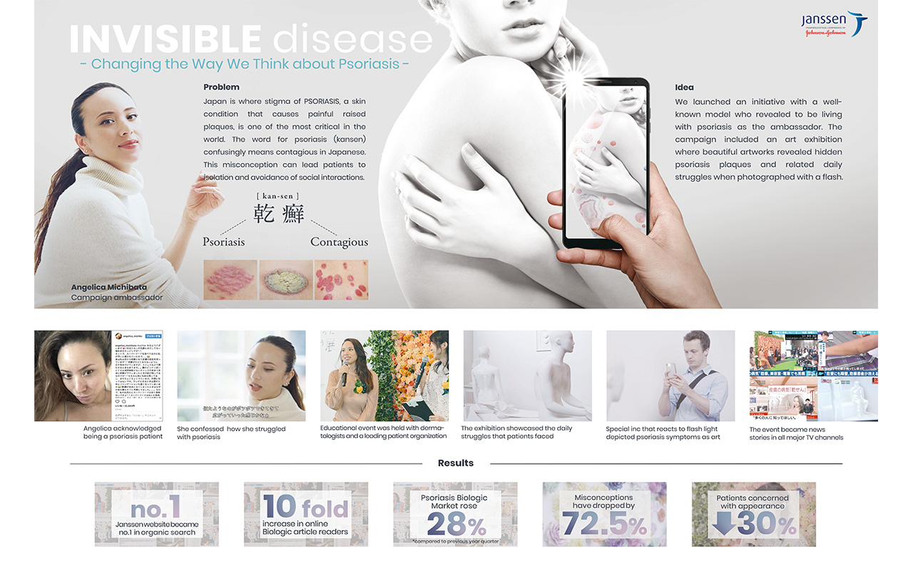 我们就此举行了一项倡议活动,并让一位患有牛皮癣的知名模特来担任宣传大使。该活动包括一场艺术展,在闪光灯下,这些漂亮的艺术作品展示了不为人知的有关牛皮癣病的故事,并讲述了患者与之斗争的日常经历。