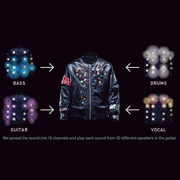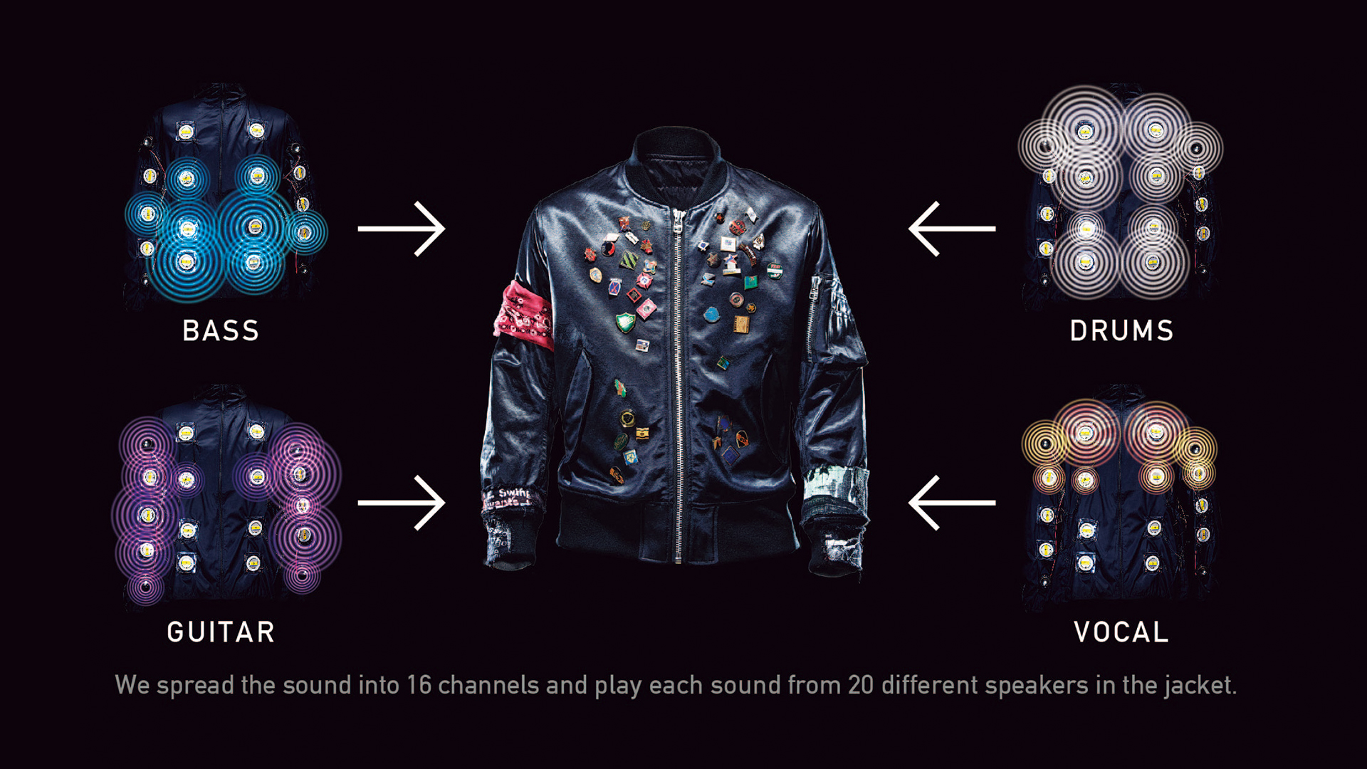 LIVE JACKET是一种可穿戴设备,能令你随时随地感受现场音乐表演的魅力。首先,我们与拥有超高现场表演水平的人气摇滚乐队ONE OK ROCK合作。我们重新合成他们的一支新单曲,然后通过二十只附带在一件特制夹克衫上的微型播放器播放出来。人声、吉他、贝司和鼓声……我们将所有16个声道混合起来同时播放。通过LIVE JACKET,我们创造了全新的音乐体验,完全再现我们在音乐会现场时全身心投入的感觉。为了宣传ONE OK ROCK的这支新单曲,在LIVE JACKET初次亮相时,我们将邀请歌迷前来试穿,体验全球“首件”身临音乐会现场的感觉。