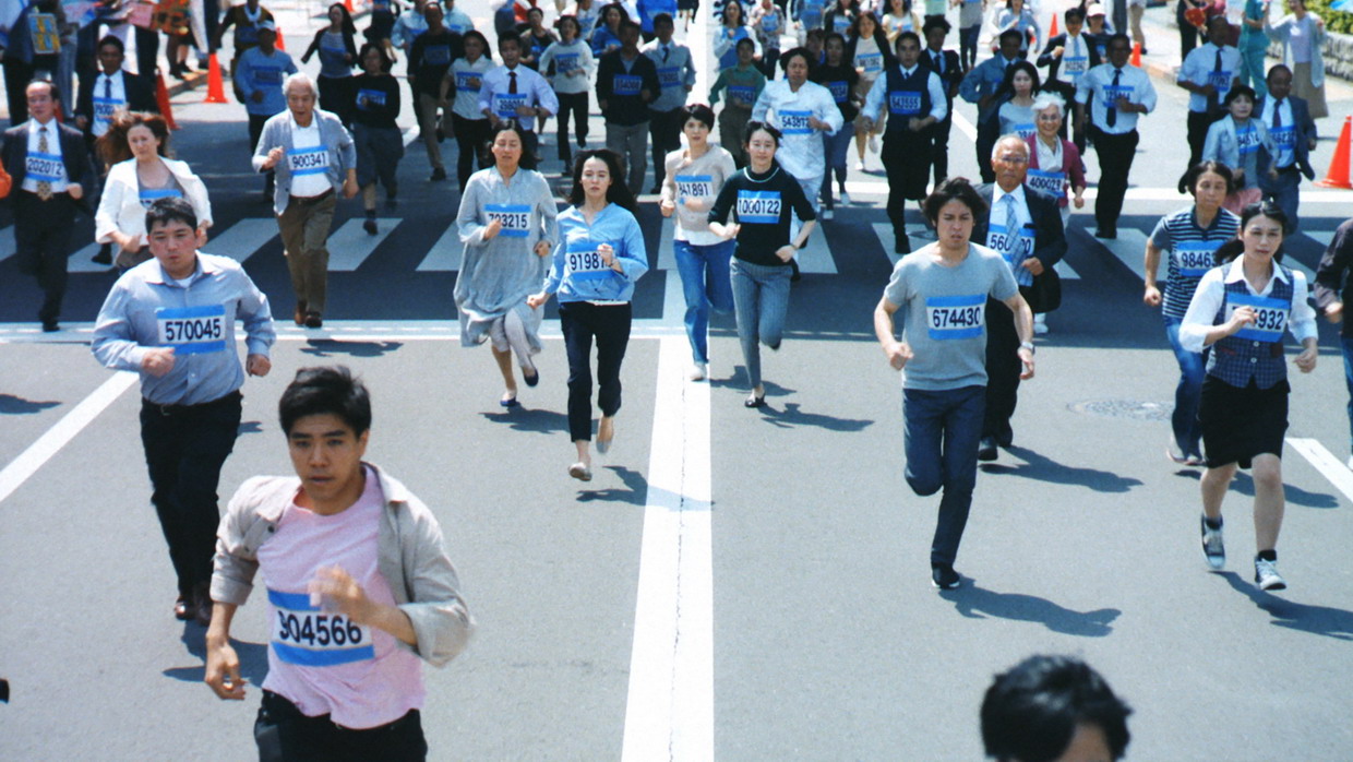 不同位置的女性突然收到一件马拉松背心和医疗检验结果。(背心上的数字代表日本每年新出现的癌症患者规模)