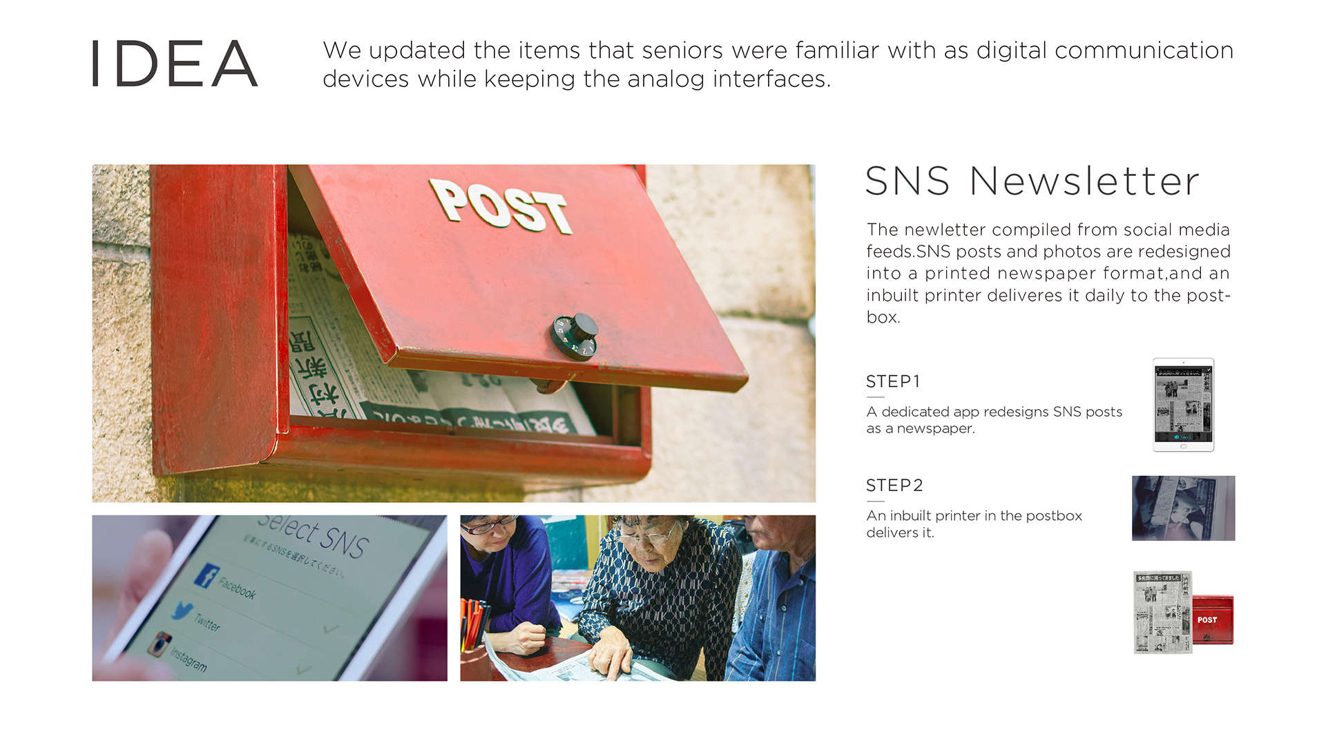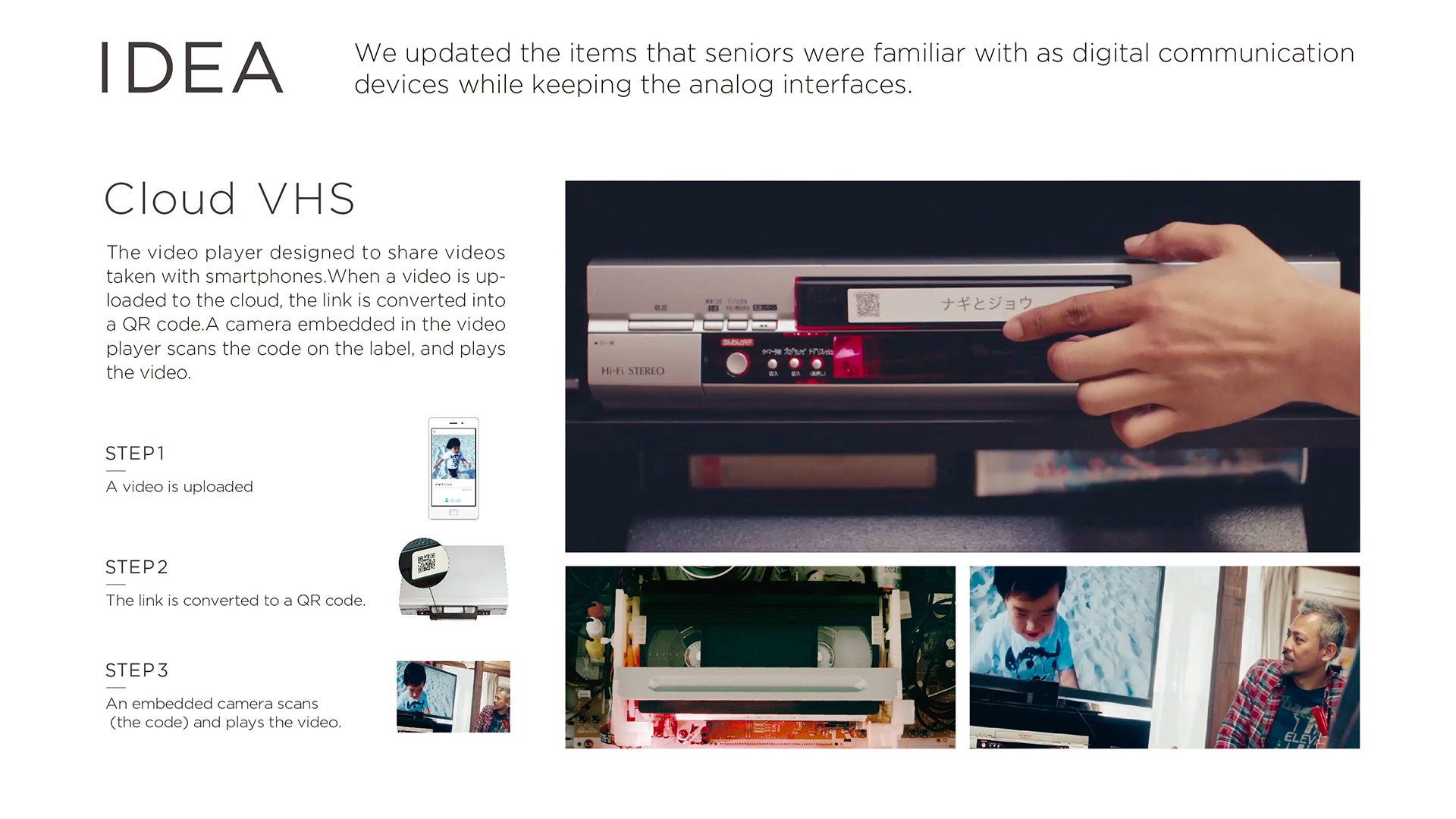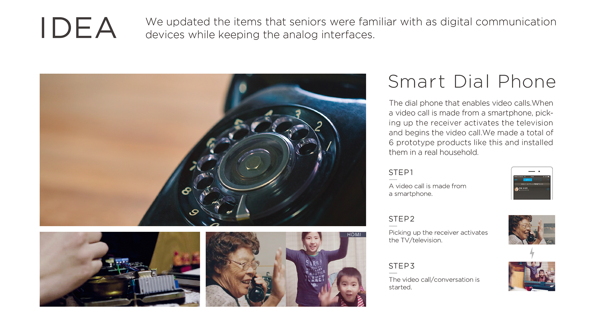 日本智能手机运营商软银改造了几款传统通讯设备,为其加上数码功能,让老人们在不使用智能手机的情况下也能跟孙辈们通过数字通信共享日常生活的点滴我们改造了6个传统通讯设备,并安装在一个现实的家庭中。我们制造了一个机会让大家去注意到那些“不得不去跟上全新技术”的人们,通过创意使得技术更贴近人们的生活。