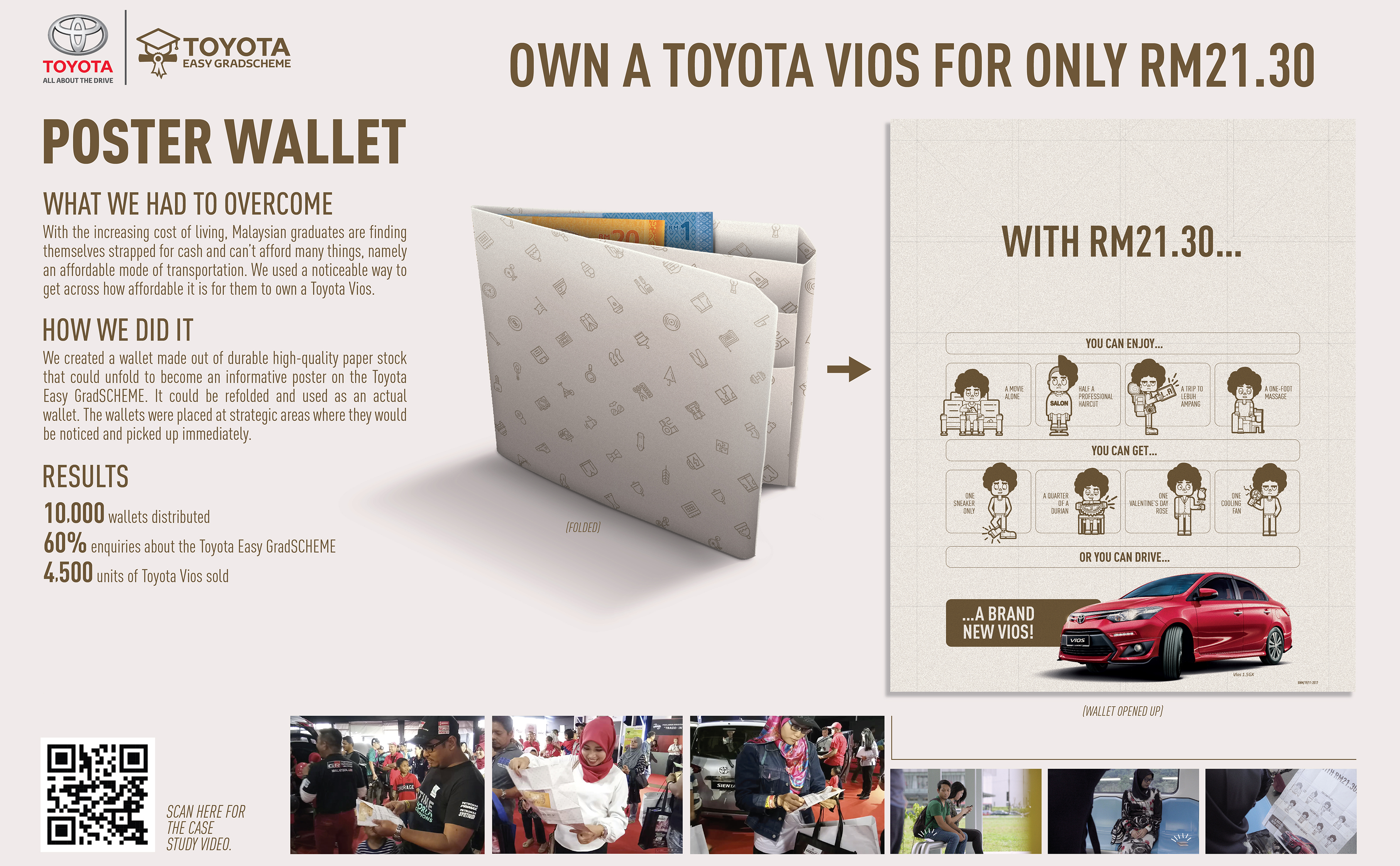 我们使用高质量的耐用纸材制作出一种钱包,它展开来就变成了宣传Toyota Easy GradSCHEME汽车融资计划的海报,合起来能当普通的钱包一样使用。钱包投放在重要的地方,人们能轻易注意到它们,并会立即将它们拿到手中。