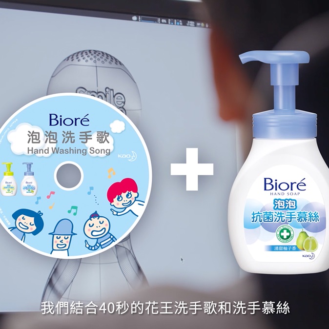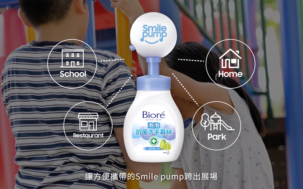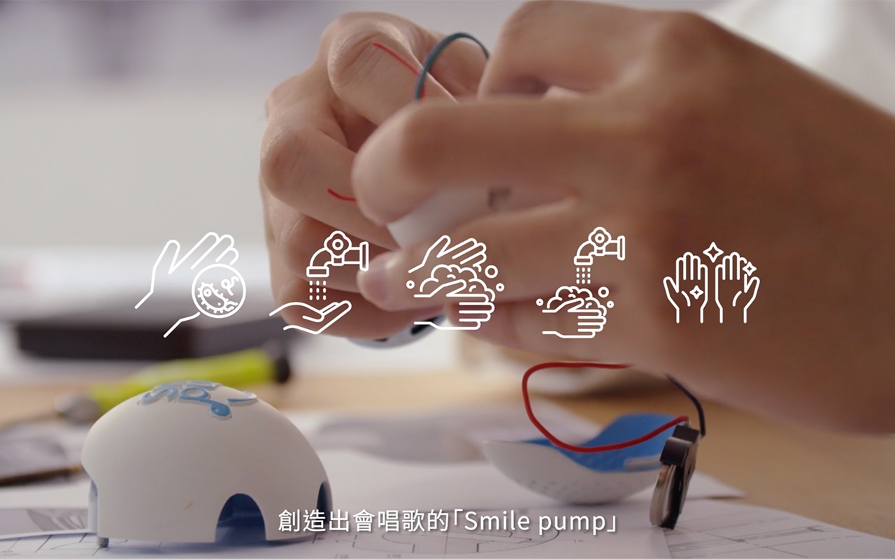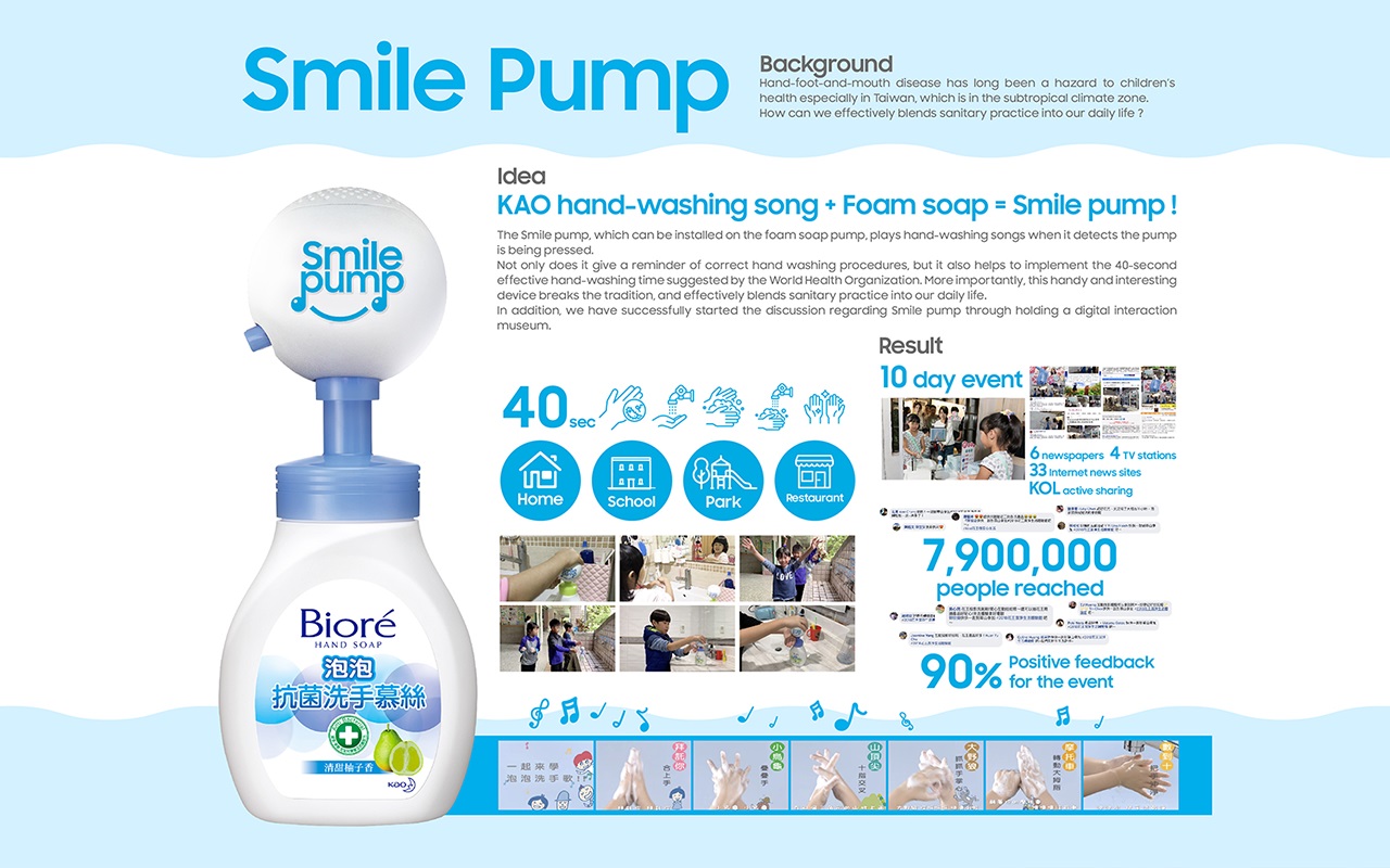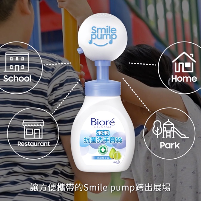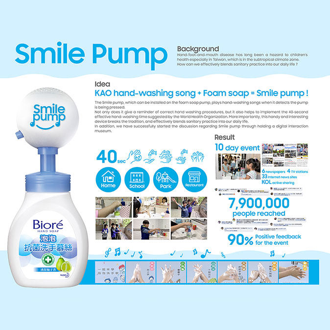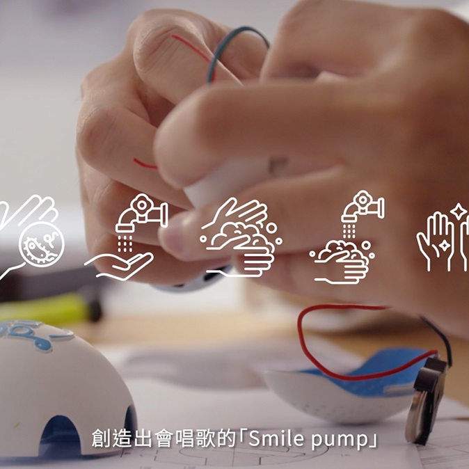 我们发现,儿童对于单向的宣导专注力有限;但是对于音乐却有着天生的热爱!因此利用孩子喜欢音乐的特质,我们创造了Smile pump!能够安装在洗手慕丝按压头上的Smile pump,透过感压装置播放洗手歌曲。不只能轻松提醒正确的洗手步骤,也能轻易落实40秒有效洗手时间。