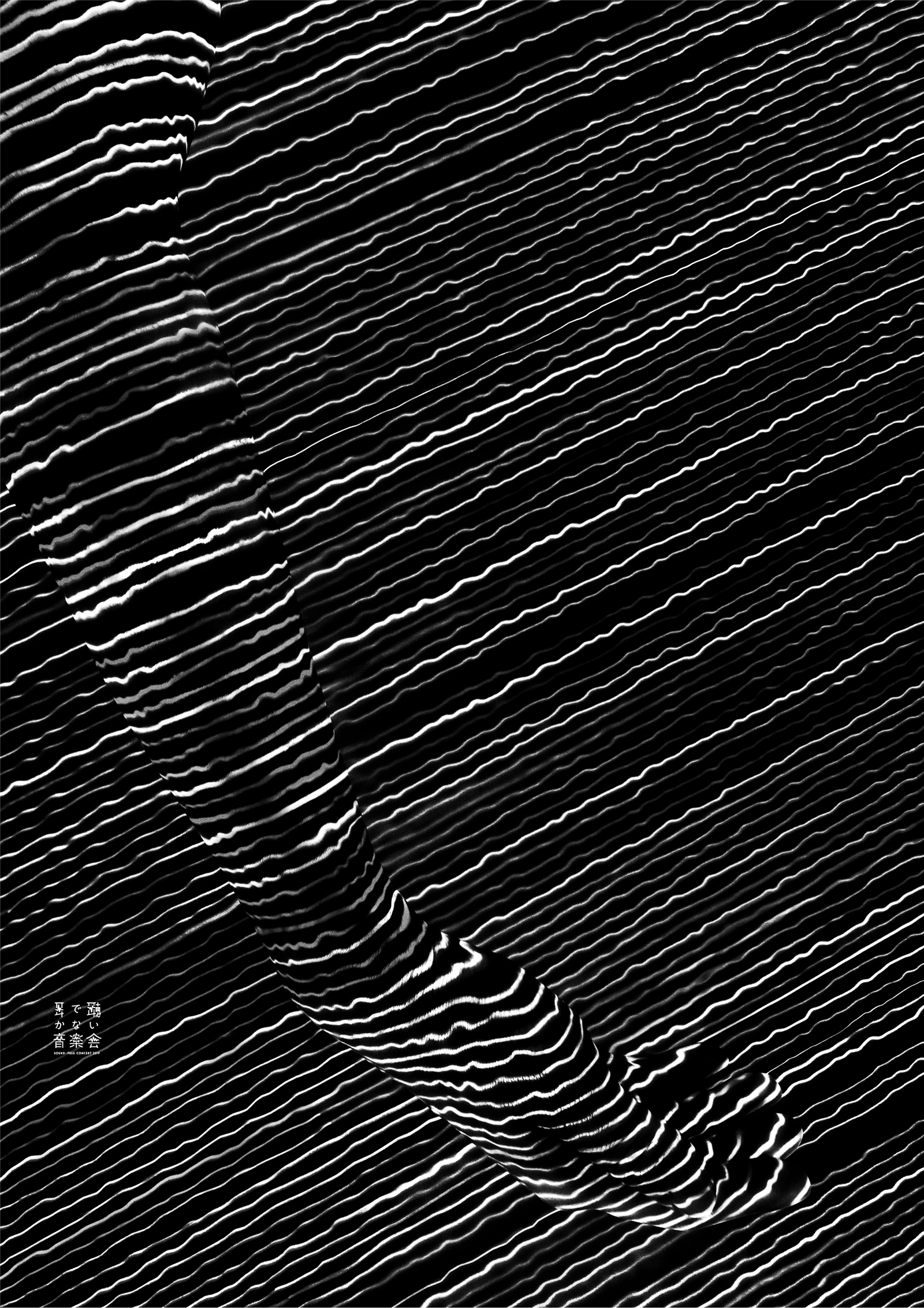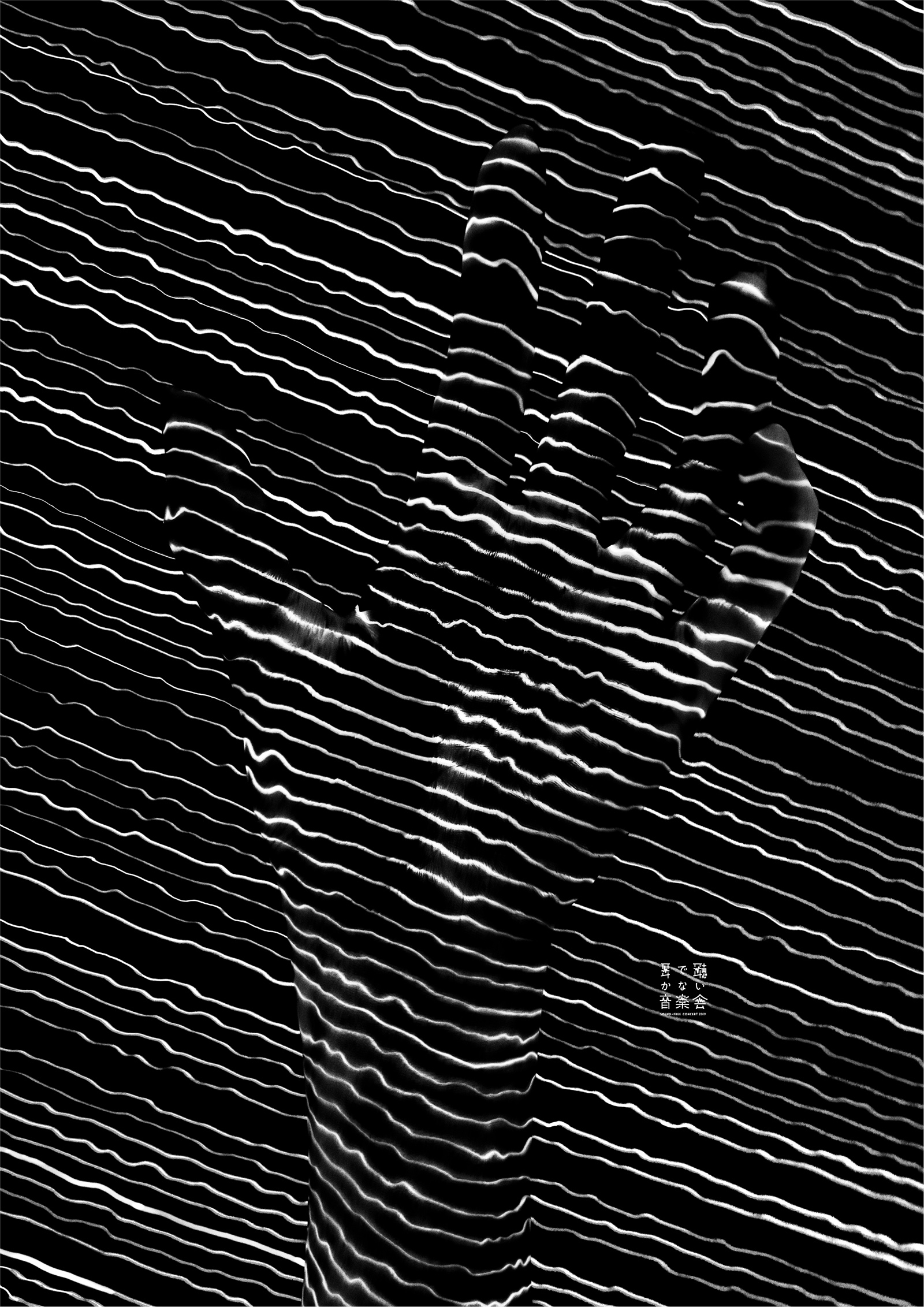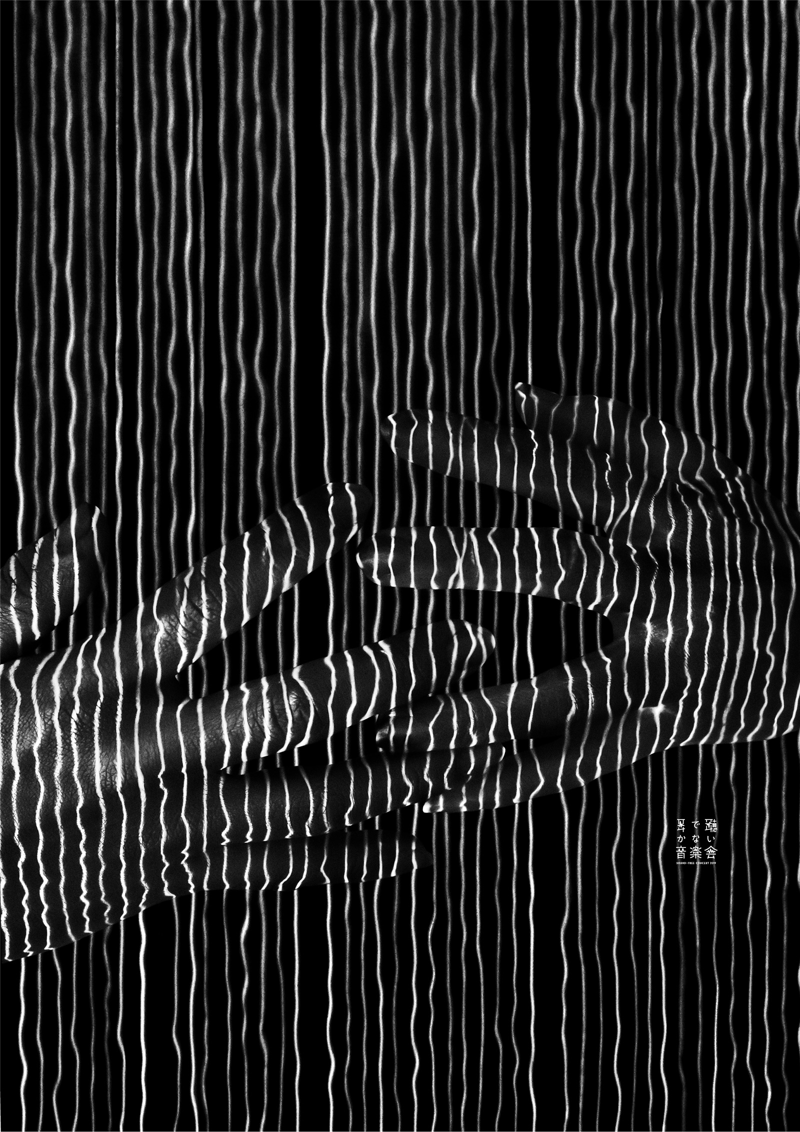 聚焦于将音乐变成声波并在空气中传播,能让耳膜和身体感到微妙振动这一原理,我们制作了海报来宣传 “无声音乐会”。海报形象地展示了无声音乐会最突出的特点,即通过手来体验“听”管弦乐队。这是通过将音乐转换成声波,然后用激光切割机切割出声波的形状的表达形式。然后把光线投射到手上。黑色和白色的氛围让人联想到乐谱,通过摄影技术再把对光的高度感觉和手型的体温进行图形化。