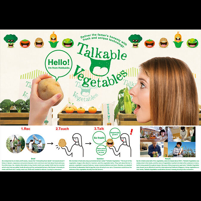 由于蔬菜的可靠推销,销售额增长约250%。会说话的蔬菜被媒体争相报道,蔬菜的声音不止传达到HUG Mart的客户耳中,也触及了全日本。凭借这种先进方式,会说话的蔬菜被札幌国际艺术节选为官方作品,也是美国德克萨斯州South By Southwest®创新大会及艺术节的必看作品。会说话的蔬菜以蔬菜作为全新媒介,成功地将农户的正直与热情展现在消费者眼前。