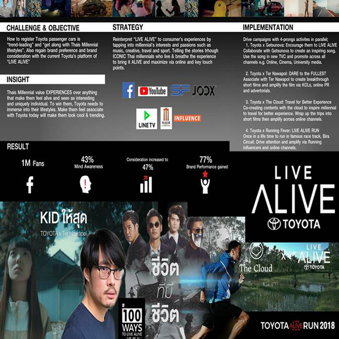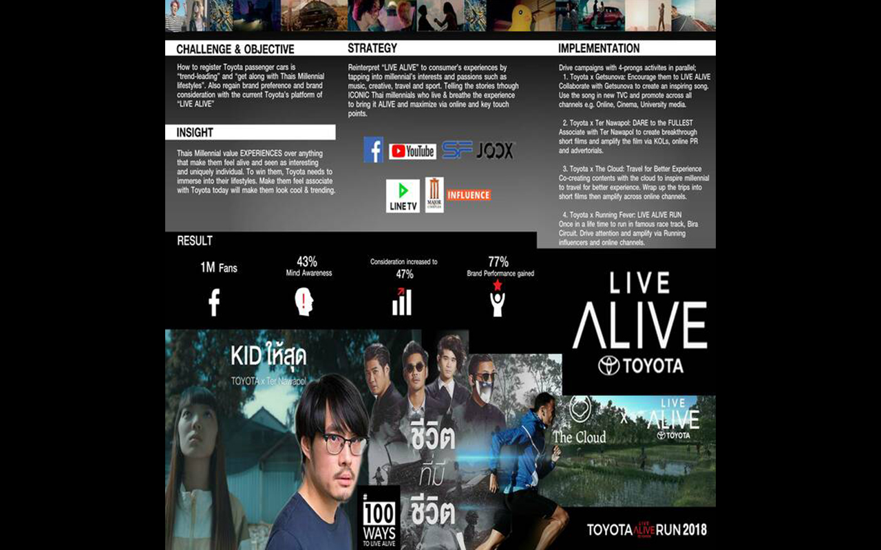 泰国的千禧一代最为看重体验,尤其是那些让他们感到鲜活、有趣和独特个性的事物。要赢得他们的青睐,丰田需要以细腻贴心而亲切友善的方式,深入了解他们的生活,将他们与我们的品牌联系起来,让他们感到自己很酷炫、很时尚。所以,在走进千禧一代的兴趣爱好的过程中,我们从顾客体验的角度,重新诠释了当前的“Live Alive”平台。我们通过享受着这种体验的泰国千禧一代的典型人物故事,打动目标消费群体、吸引公众关注并获取消费者之间的口碑。我还通过关键影响力人物来影响亚文化受众,通过网络和关键接触点最大程度地提升体验。我们指定了一份四管齐下的推广计划,在音乐(丰田×知名音乐人Getsunova)、创意(丰田×知名电影制作人Ter Nawapol)、旅游(丰田×The Cloud网站)和运动(丰田× Running Fever)等方面同时展开活动。